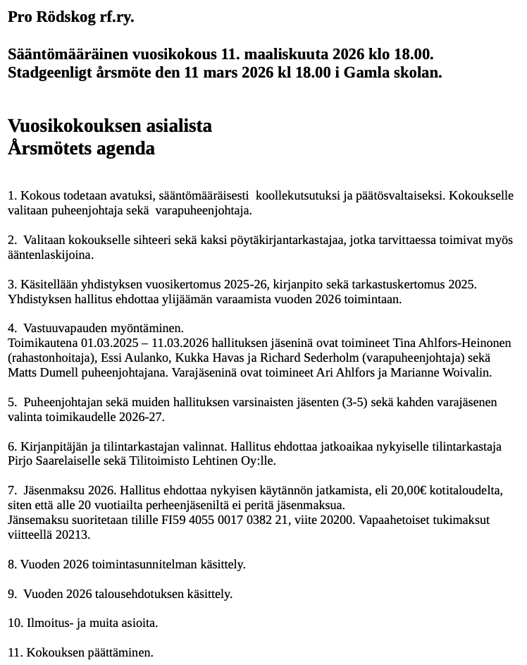 - Föreningens e-post prorodskog@rodskog.fi är registrerad som non-profit och därmed avgiftsfri.