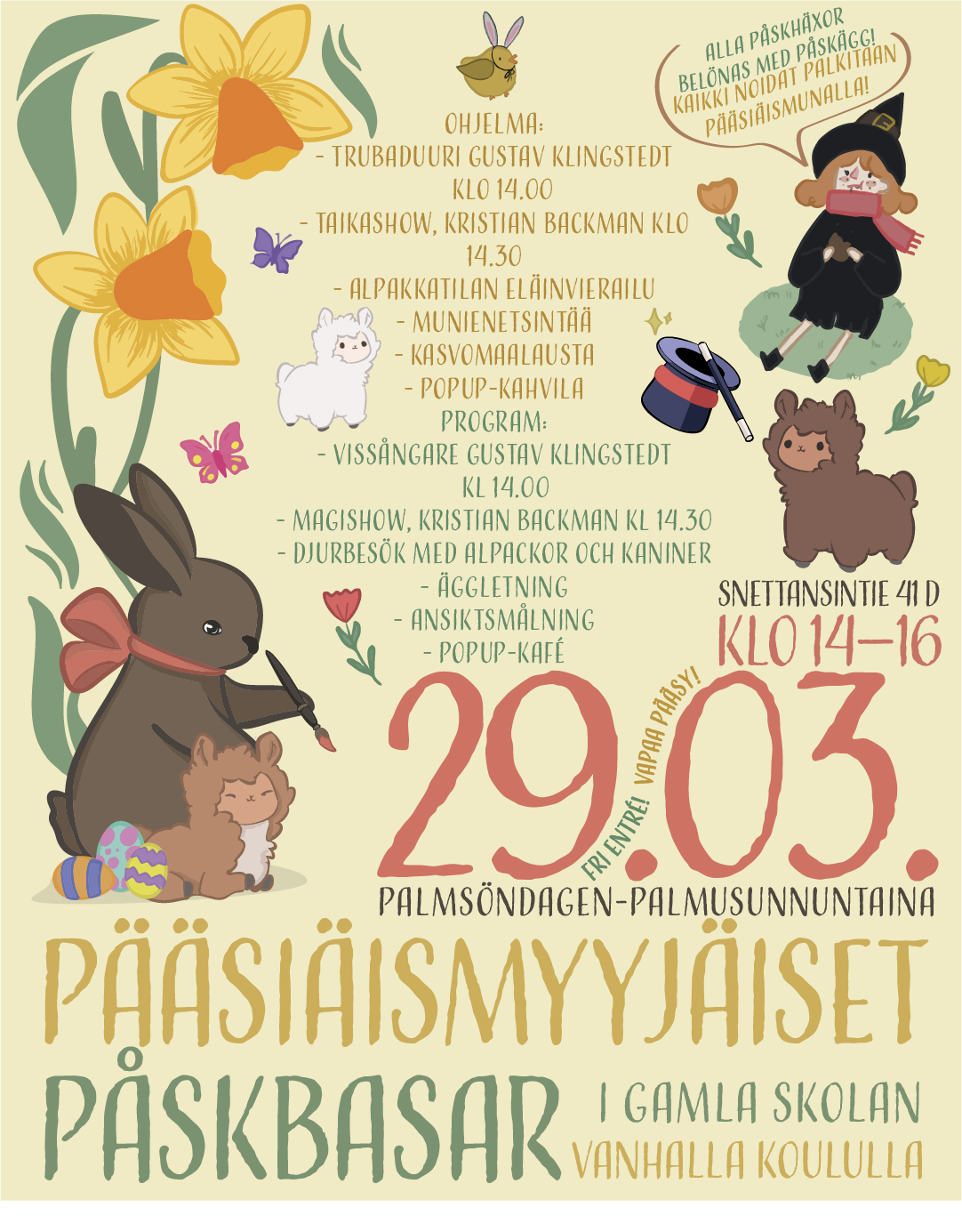 Palmsöndagen den 13 april lockade påskbasaren åter småhäxor och föräldrar för att se på gästande djur, måla ansikten, leta ägg och lyssna på musik av Gustaf Klingstedt. Pop-up kaféet och försäljning bidrog till stämningen.